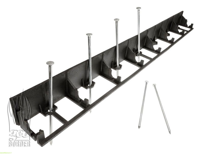 Obrzeże trawnikowe geoBORD przytwierdza się do podłoży miękkich jak trawnik, ziemia, piasek kotwami z tworzywa (KOTWA 24 cm), do podłoży twardych jak glina, tłuczeń można zastosować metalowe gwoździe (geoNAIL). Na odcinki proste stosujemy 3 szt./mb, przy łukach i kołach 4-5 szt./mb.